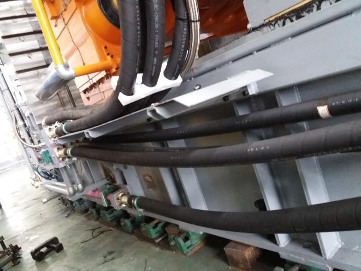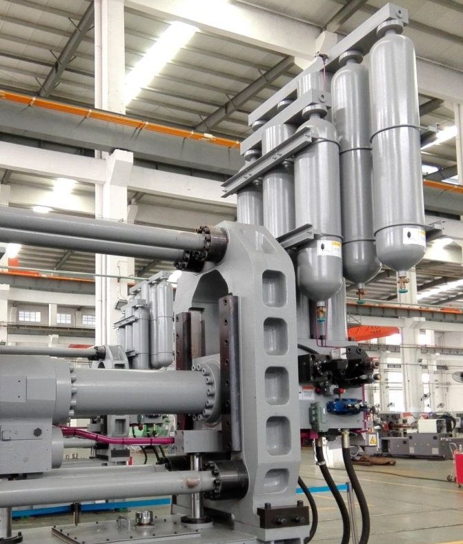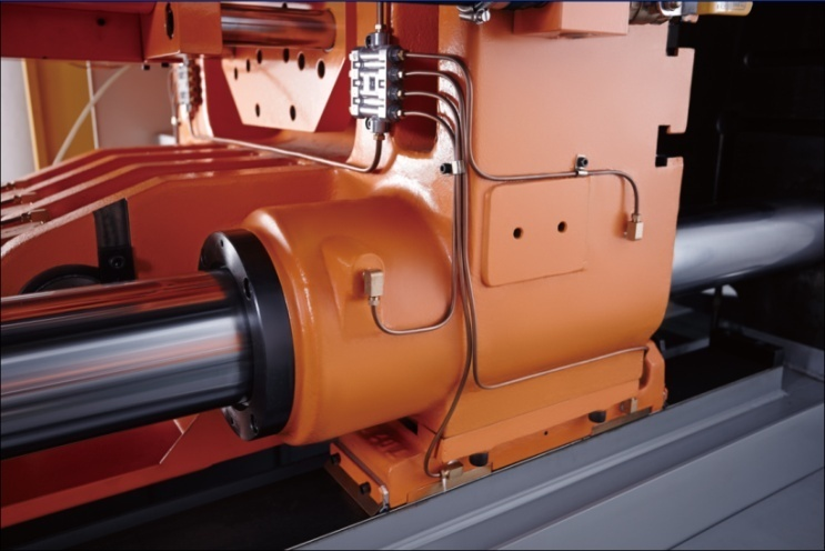 ①壓射系統(tǒng):采用儲能器容量加大型設(shè)計(jì),強(qiáng)化系統(tǒng)壓射性能,減少系統(tǒng)壓降;配置更粗大的壓射系統(tǒng)油管,通流能力更強(qiáng),響應(yīng)快速,且因壓力損失小,造成的油液升溫更小,能耗更低;拉桿加粗設(shè)計(jì),確保剛性及模板平行度,增壓及壓射水平同向布局結(jié)構(gòu),提升壓射系統(tǒng)的穩(wěn)定性。